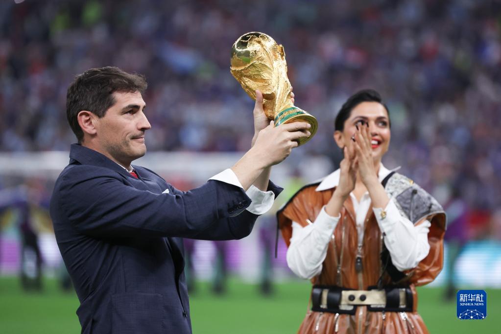 12月18日,前西班牙隊守門員卡西利亞斯(左)在比賽前展示大力神杯。新華社記者 曹燦 攝