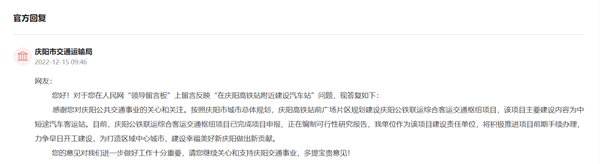 收到網民留言后,慶陽市交通運輸局及時進行了回復:“按照慶陽市城市總體規劃,慶陽高鐵站前廣場片區規劃建設慶陽公鐵聯運綜合客運交通樞紐項目,該項目主要建設內容為中短途汽車客運站。目前,慶陽公鐵聯運綜合客運交通樞紐項目已完成項目申報,正在編制可行性研究報告,我單位作為該項目建設責任單位,將積極推進項目前期手續辦理,力爭早日開工建設,為打造區域中心城市,建設幸福美好新慶陽作出新貢獻?!?/p>