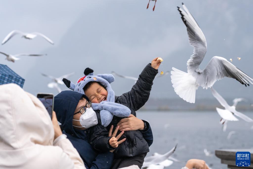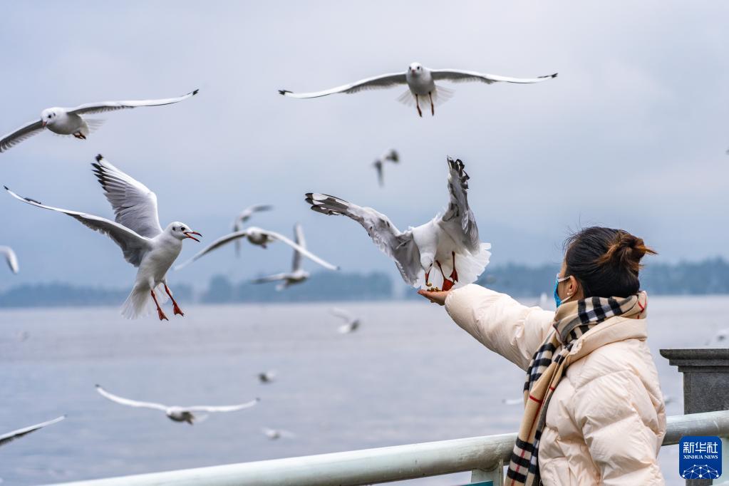 1月1日,游客在云南昆明滇池海埂大壩投喂紅嘴鷗。