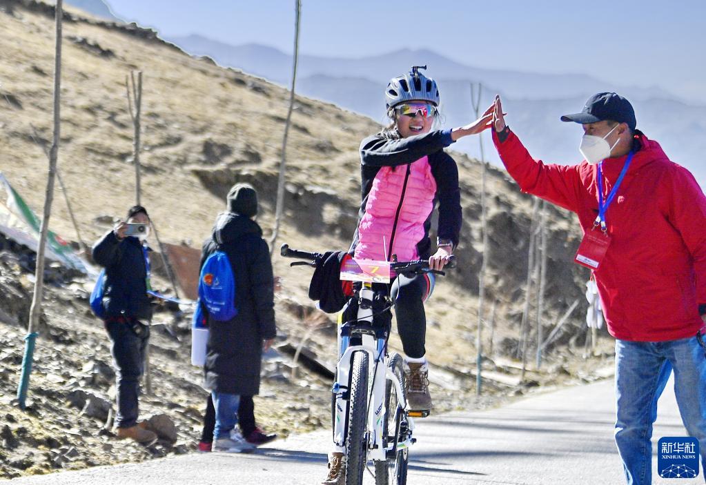 1月1日,在西藏拉薩市,一名參賽者在抵達自行車爬坡比賽終點后慶祝。