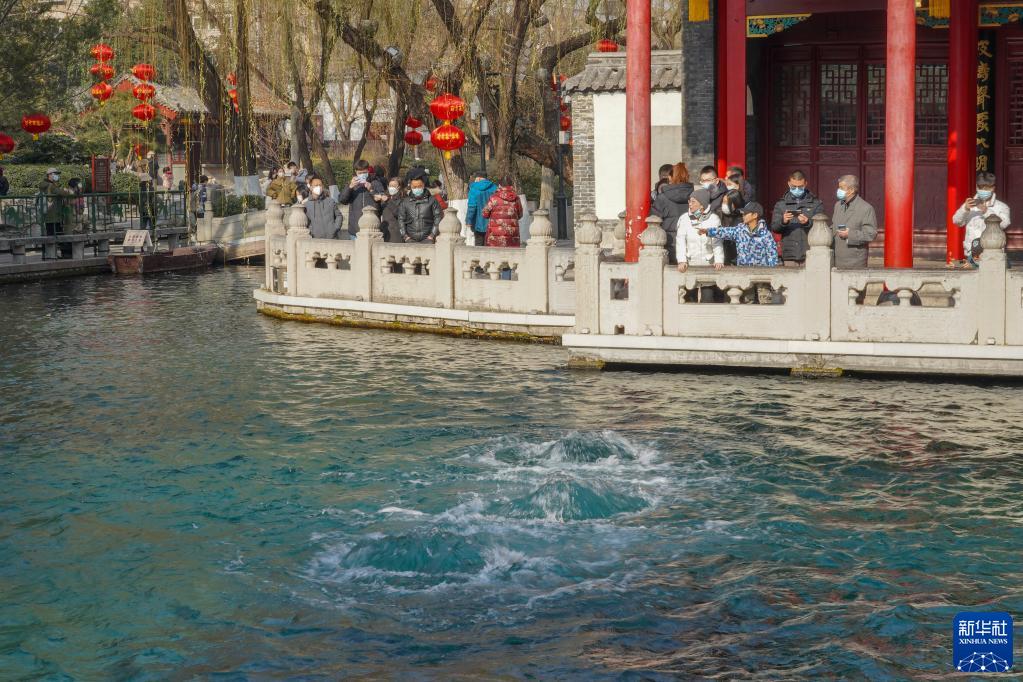 1月1日,游客在山東濟南天下第一泉風景區白石泉畔賞泉觀景。