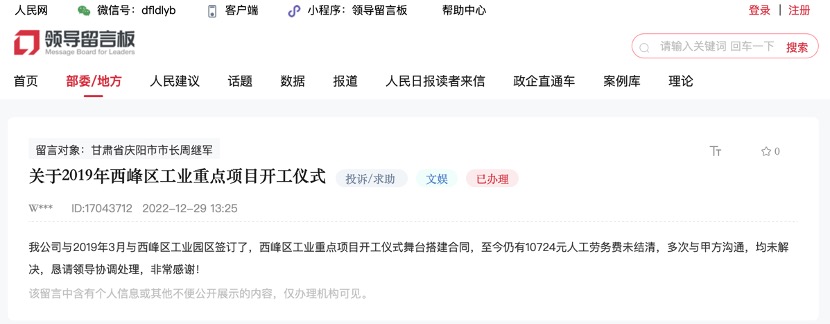 辦得好|被拖欠近三年的勞務費 甘肅慶陽一網友留言兩天后到賬