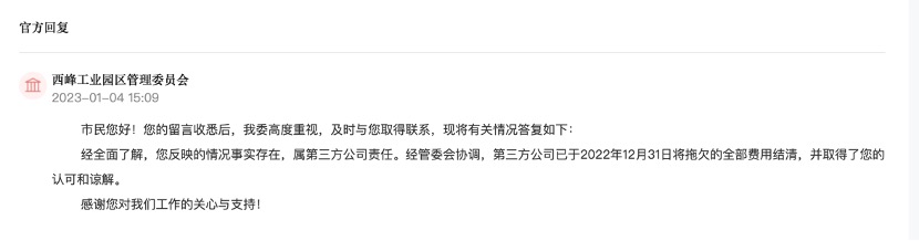 收悉留言后,西峰工業園區管理委員會立刻對網民留言反映的情況進行了核實,“經全面了解,您反映的情況事實存在,屬第三方公司責任。經管委會協調,第三方公司已于2022年12月31日將拖欠的全部費用結清,并取得了您的認可和諒解?!?/p>