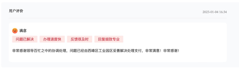 “非常感謝領導百忙之中的協調處理,問題已經由西峰區工業園區妥善解決,非常滿意!非常感謝!”留言辦理完成并拿到勞務費后,該網友給予了“滿意”的評價。