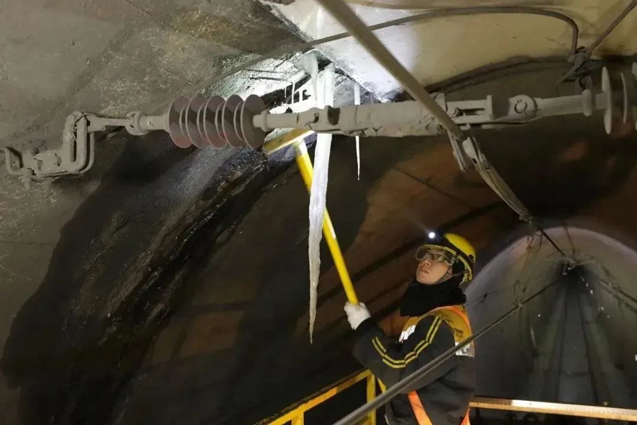 “每年冬季嚴寒時段,隧道拱頂壁上就會‘長’出冰柱,這些冰柱如不及時處理,隧道頂結冰將使鐵路供電系統跳閘,嚴重危及行車安全?!彼淼览锖畾獗迫?,作業車緩慢前行,王大友站在高高的作業平臺上搜尋結冰點,“前方有冰柱,準備打冰?!闭f著王大友和工友們拿起五米多長的絕緣桿進行“精準打擊”,打冰桿有十多斤,揮動起來十分費力,操作人員不僅要把握揮舞力度,還要隨時注意掉下來的冰塊,碎冰渣如雨點般掉落,隨后他們熟練地擦拭絕緣子,緊固螺栓,檢查完后他們繼續前行。