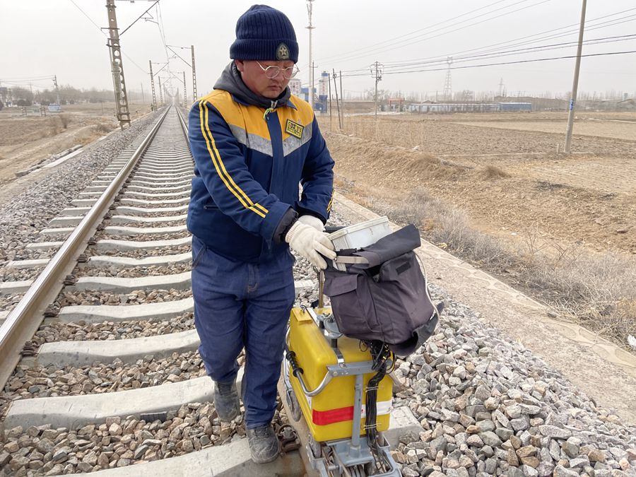 進入春運后,蘭州、銀川等地的氣溫驟降,最低氣溫降至零下15℃,冒著凜冽的寒風,王龍和工友們聚精會神地推著鋼軌檢查儀,在包蘭線景泰至長城站間進行著鋼軌探傷作業。眼前,兩條平行線延伸到遠方,望不到盡頭。