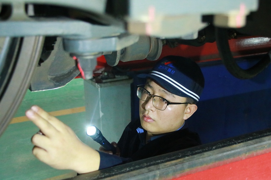 隨著春運動車開行頻次的增加,陳旭剛的工作量也隨之加大?!按哼\期間,我們每晚通常需要檢修動車10組,在地溝作業時間5個小時左右,要檢查上千個部件,一晚上能夠行走大概4萬多步?!瘪Y騁了一整天的動車組每晚都要回到動車所“保養”,不僅是走行部,車內衛生間、空調、座椅等設備設施也要全面檢查,“動車組的狀態良好,旅客出行才能安心、舒心?!币涣熊嚈z查下來,腿也麻了,衣服也濕透了,但陳旭剛和班組的青年們沒看有半句抱怨,喝口水,拿起工具又鉆進了地溝。