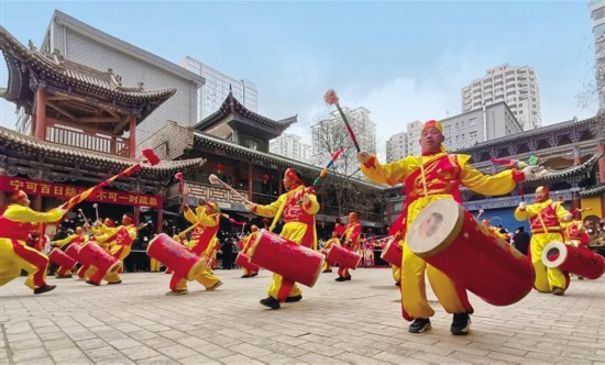 23日上午,位于張掖路的隍廟院子里熱鬧非凡、喜氣洋洋?!拔覀兊闹袊鴫簟の幕M萬家”2023年蘭州春節文化廟會活動正式拉開帷幕。振奮人心的太平鼓、虎虎生威的舞獅等經典社火輪番上演,營造出濃濃的文化年味。