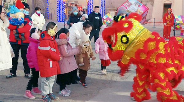 敦煌古城古街區南獅與游客互動。敦煌市委宣傳部供圖