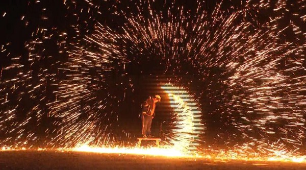 敦煌古城古街區打鐵花表演。敦煌市委宣傳部供圖