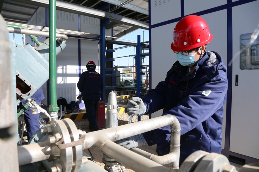 甘肅慶陽瑞海嘉能源科技有限公司工人在氦氣生產區檢查設備運行情況。盤小美攝