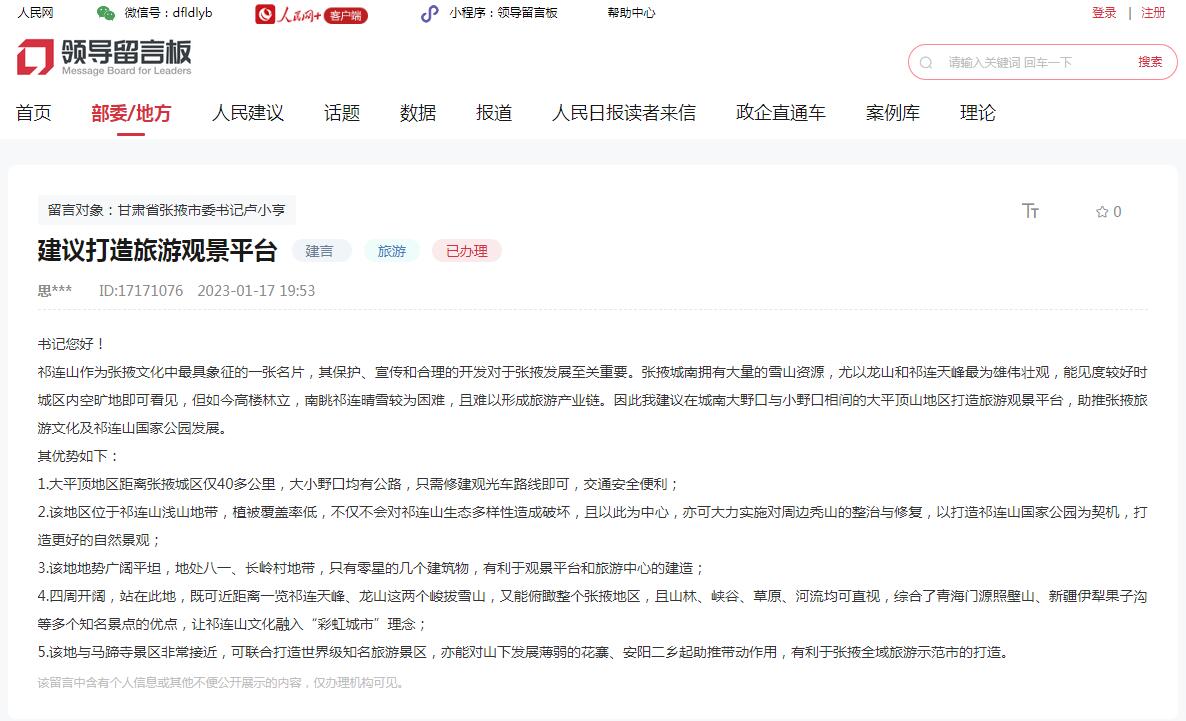 人民建議|網民建議打造觀景平臺助推旅游業發展 甘肅張掖:全面論證可行性