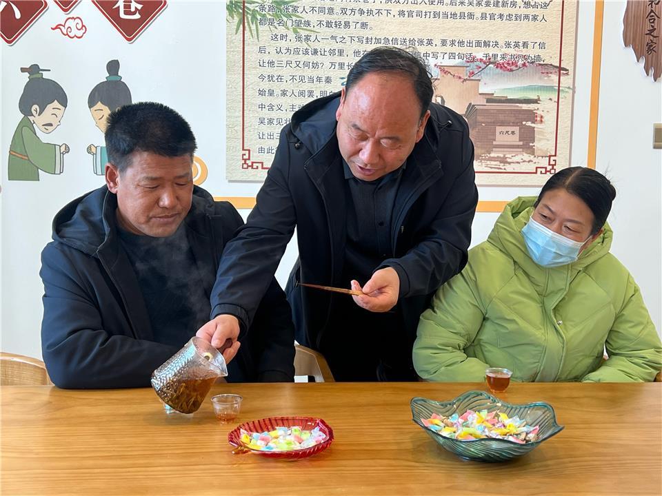 調解員為村民倒上罐罐茶。甘肅省司法廳供圖