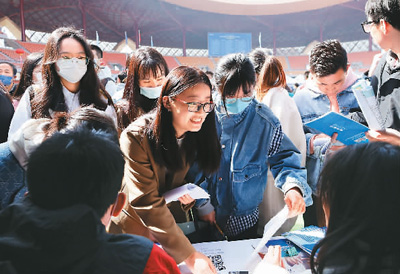 4月8日,甘肅省蘭州市首屆(2023)春季大型人才交流會開幕?;顒庸舱骷?179家招聘企業提供35000多個崗位,以現場招聘、直播帶崗、職業技能交流等形式為高校畢業生和求職者提供送崗服務。圖為求職者在咨詢招聘信息。