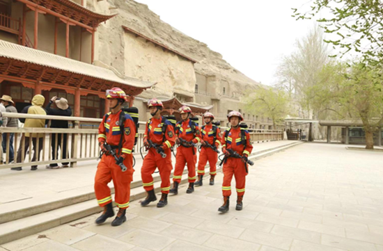 消防指戰員在莫高窟巡護執勤。竇惠惠攝