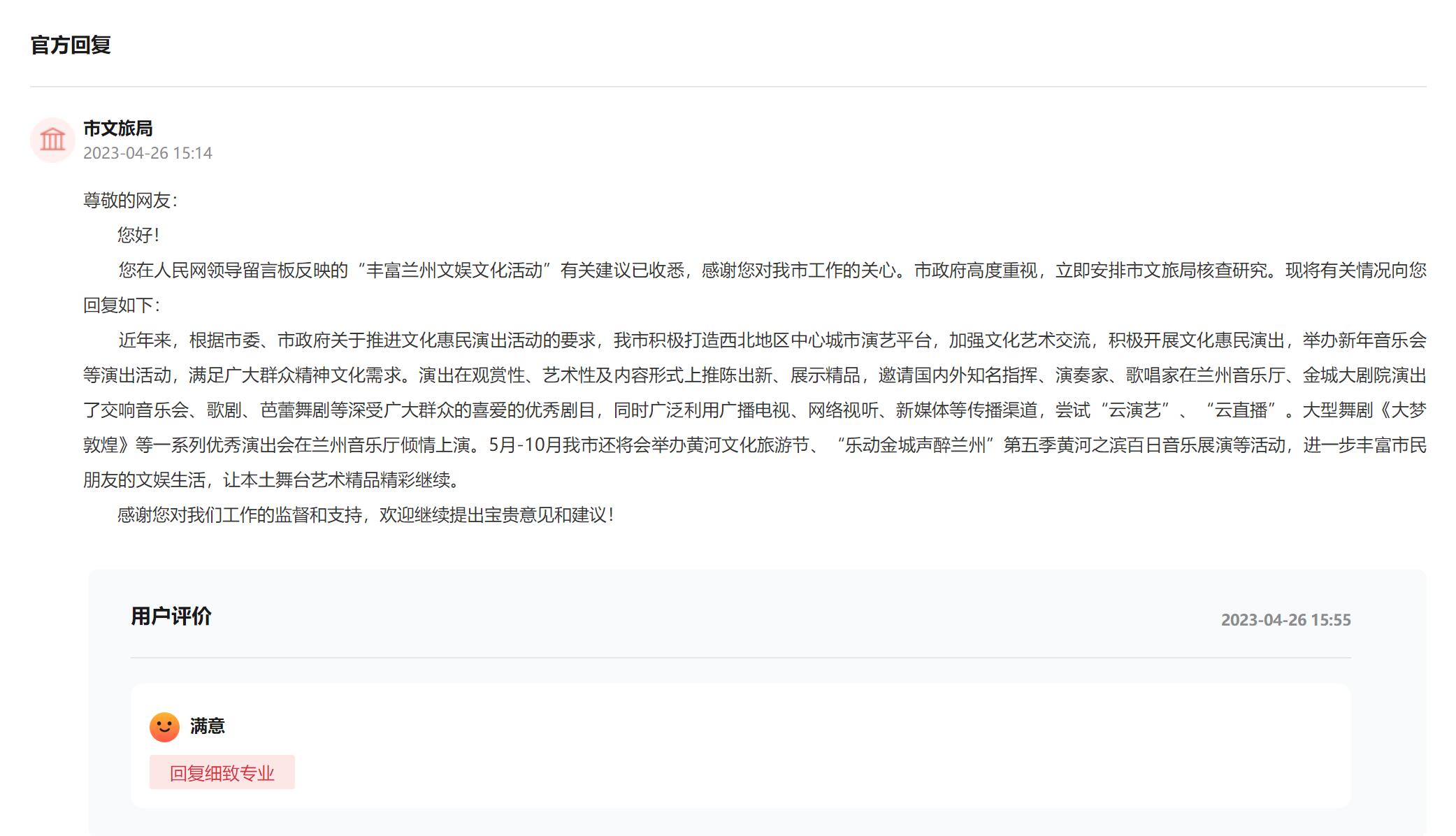 蘭州市政府高度重視網友留言,立即安排蘭州市文旅局核查研究該網友提出“豐富蘭州文娛文化活動”的相關建議。蘭州市文旅局及時回復了網友的留言:近年來,根據蘭州市委、市政府關于推進文化惠民演出活動的要求,蘭州市積極打造西北地區中心城市演藝平臺,加強文化藝術交流,積極開展文化惠民演出,舉辦新年音樂會等演出活動,滿足廣大群眾精神文化需求。演出在觀賞性、藝術性及內容形式上推陳出新、展示精品,邀請國內外知名指揮、演奏家、歌唱家在蘭州音樂廳、金城大劇院演出了交響音樂會、歌劇、芭蕾舞劇等深受廣大群眾的喜愛的優秀劇目,廣泛利用廣播電視、網絡視聽、新媒體等傳播渠道,嘗試“云演藝”“云直播”,大型舞劇《大夢敦煌》等一系列優秀演出會在蘭州音樂廳傾情上演。今年5月-10月,蘭州市還將舉辦黃河文化旅游節、“樂動金城 聲醉蘭州”第五季黃河之濱百日音樂展演等活動,進一步豐富市民朋友的文娛生活,讓本土舞臺藝術精品精彩繼續。