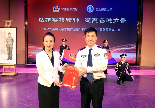 捐贈儀式中,西北師范大學向甘肅省公安廳捐贈了40幅甘肅省公安英模及榮譽集體畫像和畫冊,甘肅省公安廳向西北師范大學畫像創作教師代表頒發了收藏證,并贈送甘肅省公安作家彭海林創作的《省城公安》《省城警察》100套。