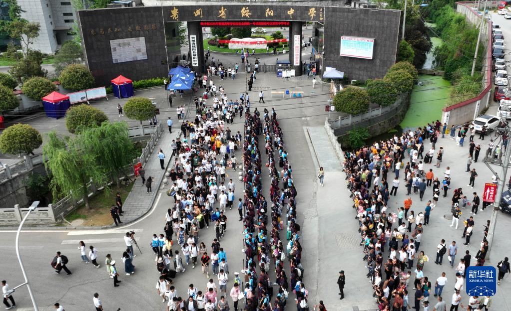 6月8日,考生考試后走出貴州綏陽縣綏陽中學2023年高考考點(無人機照片)。