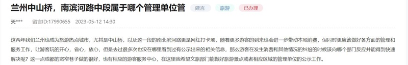 人民網蘭州6月9日電 (記者邵蘭)“這兩年我們蘭州也成為旅游熱點城市,尤其是中山橋以及這一段的南北濱河路更是網紅打卡地,更多游客的到來也會進一步帶動本地消費,但同時更應該做好各方面的管理和服務工作,讓游客玩得開心、省心、放心。去過很多次也沒在哪里看到過有公示出來的相關信息,那么游客在發生消費或其他糾紛的時候該向哪個部門反映并能得到快速解決呢?”近日,有網友在人民網“領導留言板”留言,建議蘭州中山橋及其周邊景區設置明顯的監督公示牌,進一步完善便民服務。