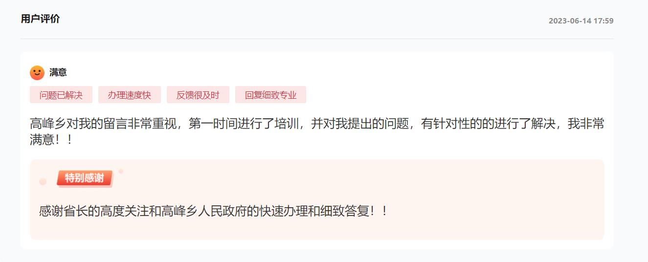 “高峰鄉對我的留言非常重視,第一時間進行了培訓,并對我提出的問題針對性地進行了解決,我非常滿意!”收到回復后,該網友給予了“滿意”的評價。