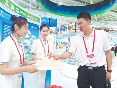 7月6日,蘭洽會客商在“食品加工館”體驗武威生產的鮮牛奶。