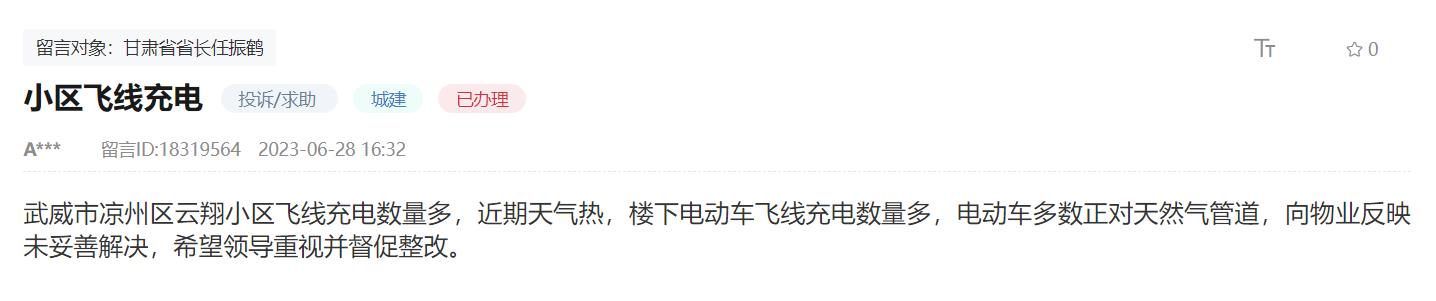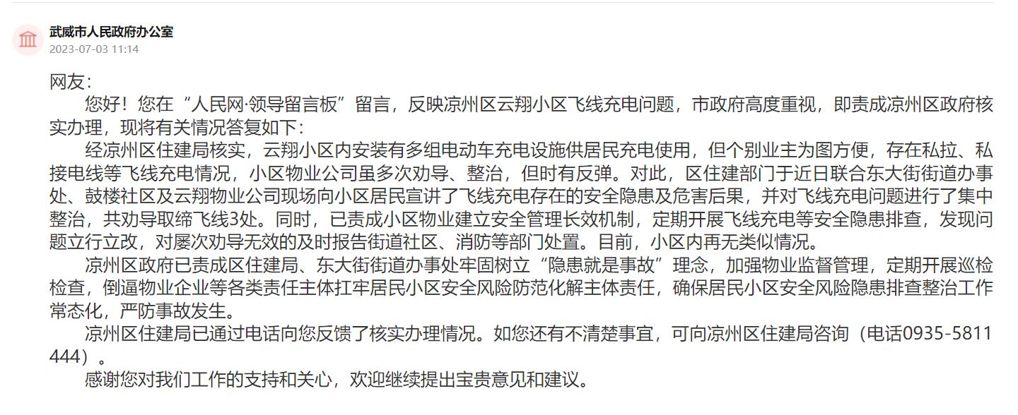 收到網友留言后,武威市人民政府辦公室及時回復留言:“經涼州區住建局核實,云翔小區內安裝有多組電動車充電設施供居民充電使用,但個別業主為圖方便,存在私拉、私接電線等‘飛線’充電情況,小區物業公司雖多次勸導、整治,但時有反彈。對此,區住建部門于近日聯合東大街街道辦事處、鼓樓社區及云翔物業公司現場向小區居民宣講了‘飛線’充電存在的安全隱患及危害后果,并對飛線充電問題進行了集中整治,共勸導取締‘飛線’3處。同時,已責成小區物業建立安全管理長效機制,定期開展‘飛線’充電等安全隱患排查,發現問題立行立改,對屢次勸導無效的及時報告街道社區、消防等部門處置。目前,小區內再無類似情況?!?/p>