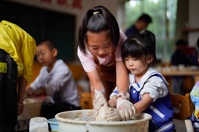定西市隴西縣楊營村“愛心陪伴”假期托管班中,孩子們正在上陶藝課。甘肅省總工會供圖