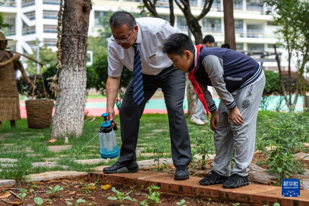 8月27日,云南省昆明市潤城學校的老師和學生在勞動體驗實踐基地給菜地澆水。