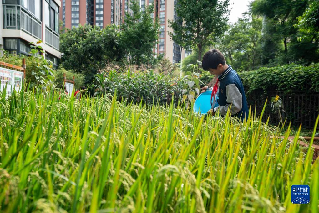 8月27日,云南省昆明市潤城學校的學生在勞動體驗實踐基地給稻田澆水。