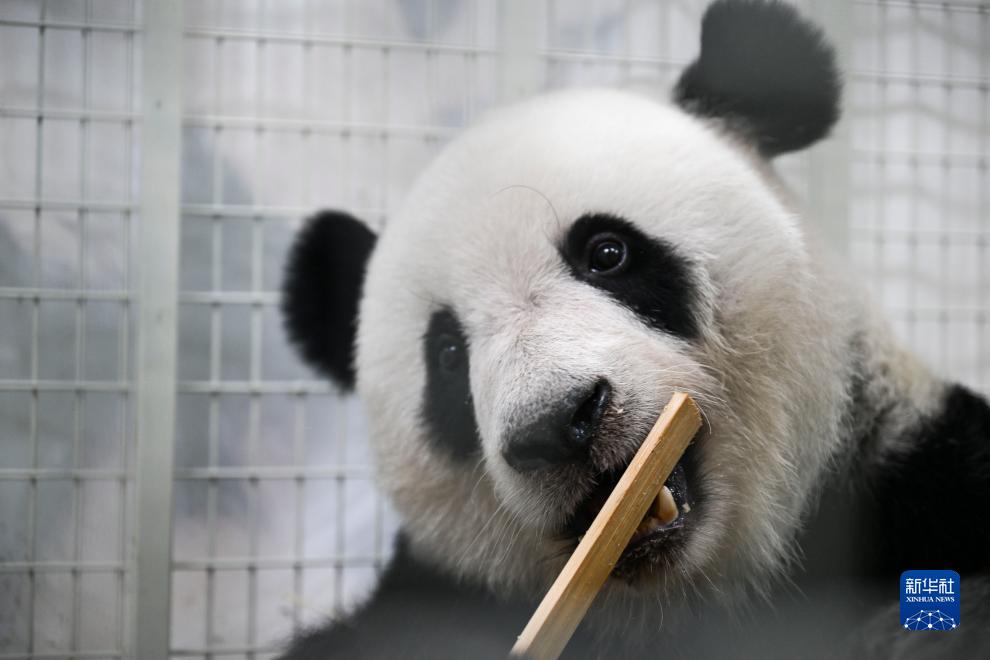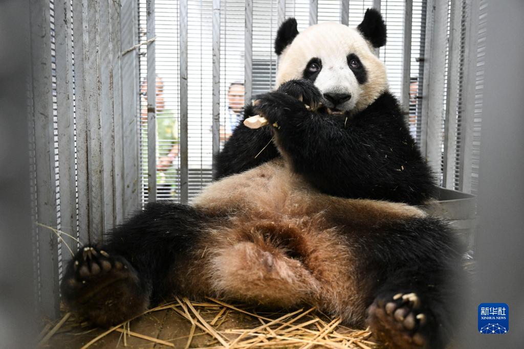 8月29日,大熊貓“升誼”在馬來西亞吉隆坡國際機場進食。新華社記者 程一恒 攝