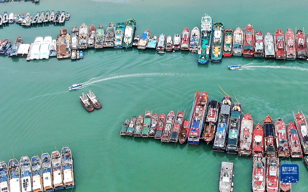 8月31日,在廣東省汕尾港避風塘,漁船歸港避風(無人機照片)。新華社記者 盧漢欣 攝