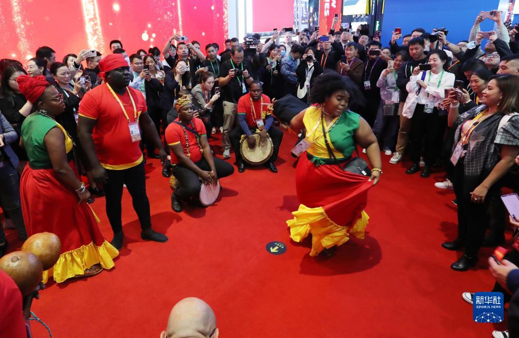 11月6日,來自第六屆進博會國家展洪都拉斯展臺的演職人員在現場進行文藝表演。