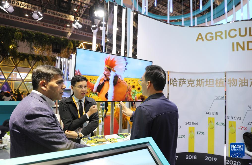 11月6日,參觀者在第六屆進博會國家展哈薩克斯坦展臺洽談。