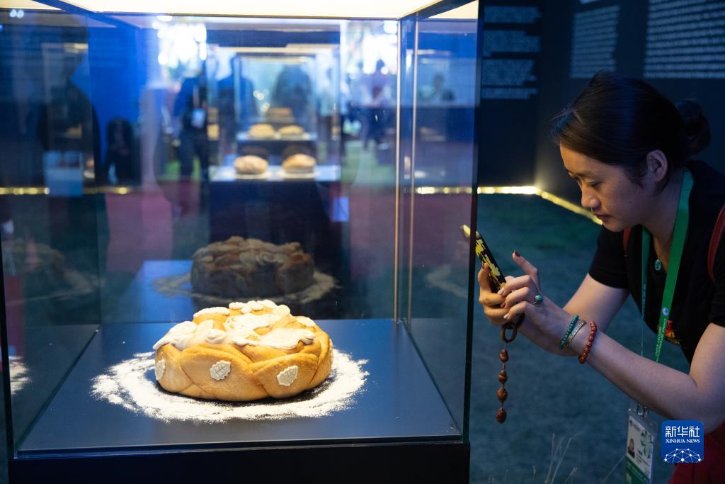 11月6日,參觀者在第六屆進博會國家展塞爾維亞展臺欣賞塞爾維亞面包。