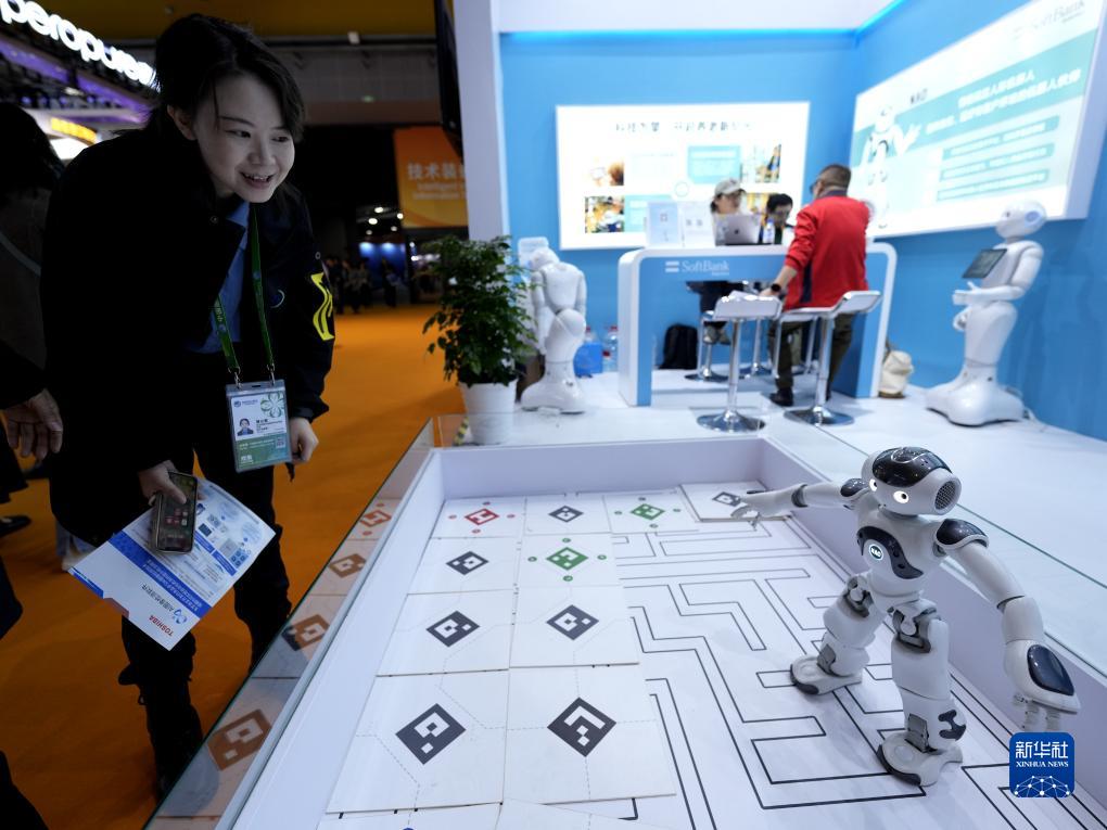 11月7日,在第六屆進博會技術裝備展區,觀眾與軟銀機器人互動。