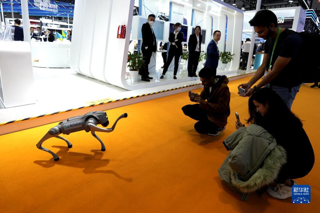 11月7日,在第六屆進博會技術裝備展區,觀眾與??怂箍嫡故镜闹悄軝C器狗互動。