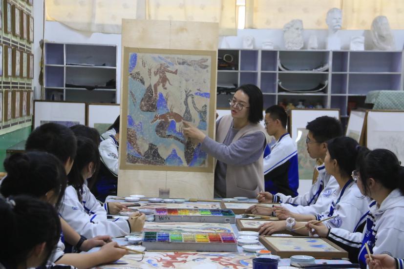 敦煌中學美術教師楊娜為學生講解敦煌壁畫藝術。張曉亮 攝