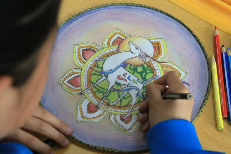 敦煌市西關小學美術社團的學生正在為帶有敦煌壁畫元素的團扇畫圖上色。張曉亮 攝