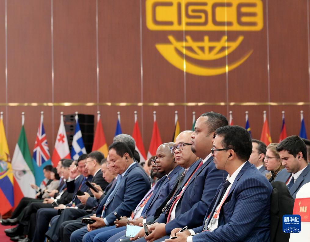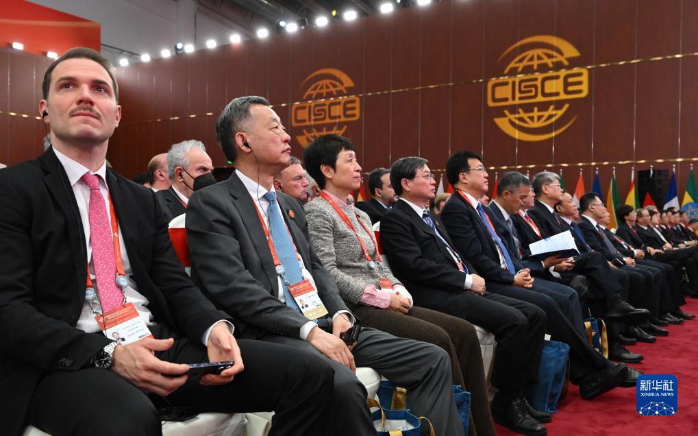 11月28日,中外與會嘉賓在博覽會開幕式現場聆聽主旨演講。