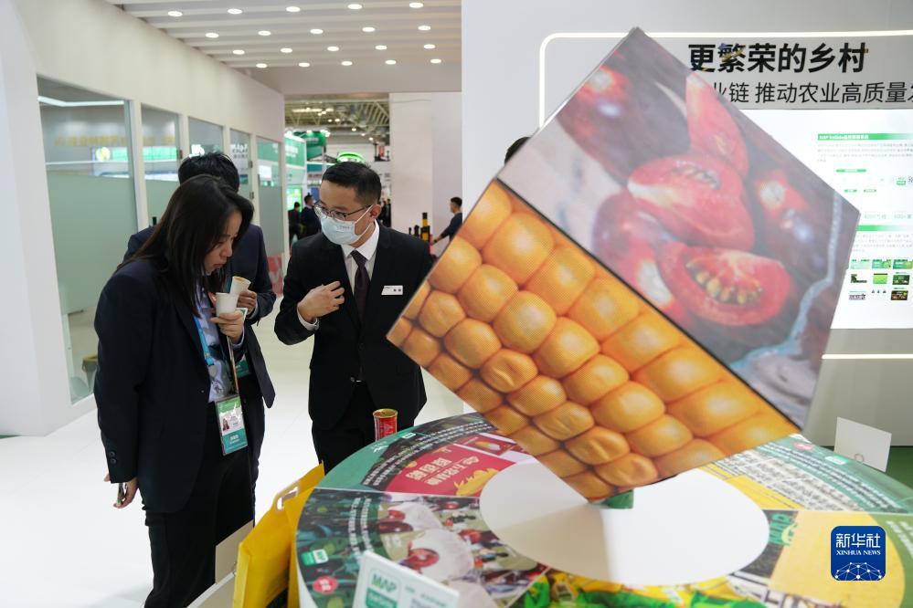 11月28日,參展商與參會嘉賓在綠色農業鏈展區交流。