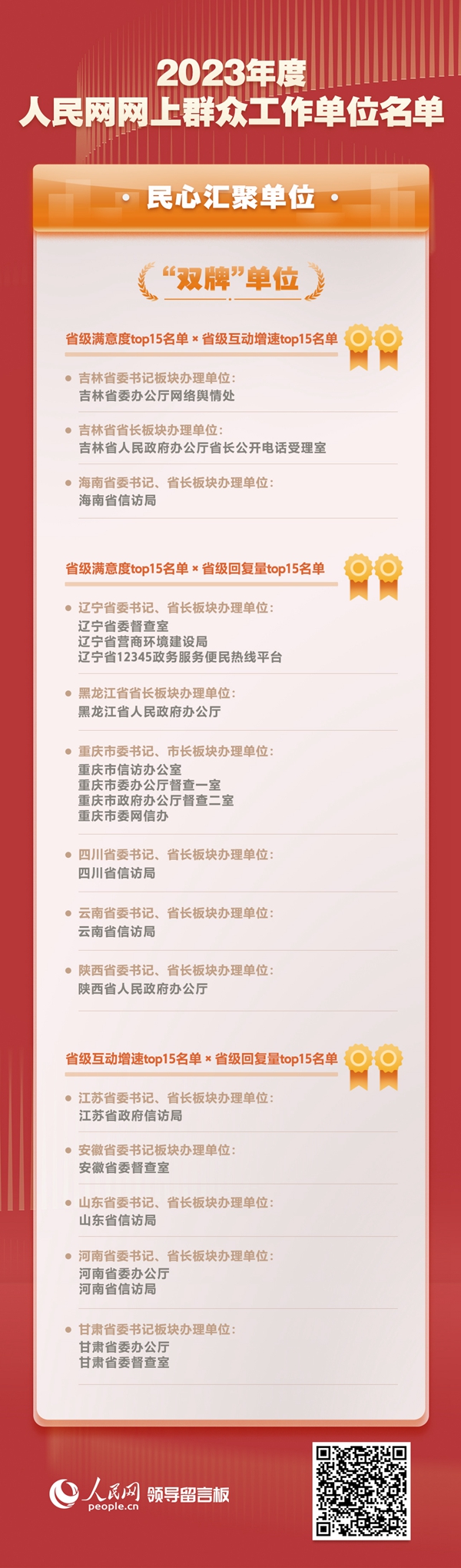 此次公布的名單綜合全國各地區各部門各單位近一年來的滿意度、互動增速、回復量等指數,著重突出各地區各部門各單位依托人民網“領導留言板”開展網上群眾工作情況,選出2023年度人民網網上群眾工作“民心匯聚單位”“實干擔當單位”“匯智為民單位”和“活力奮進單位”,共600余家。