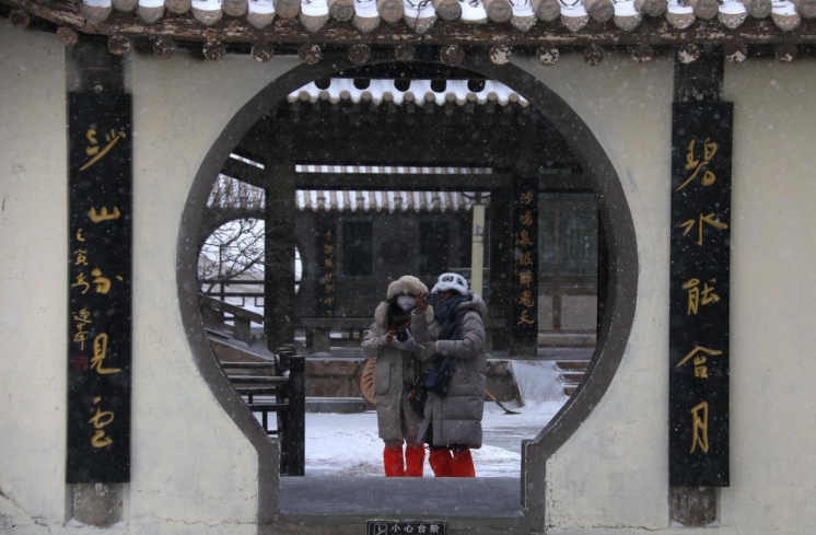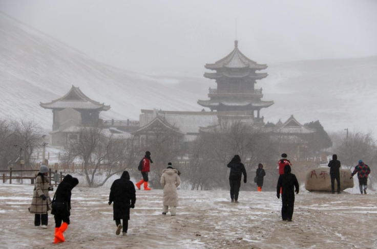 受冷空氣和高原暖濕氣流影響,12月14日,甘肅省敦煌市迎來降雪。雪后的鳴沙山月牙泉景區景色如畫,美不勝收。(張曉亮 習剛)
