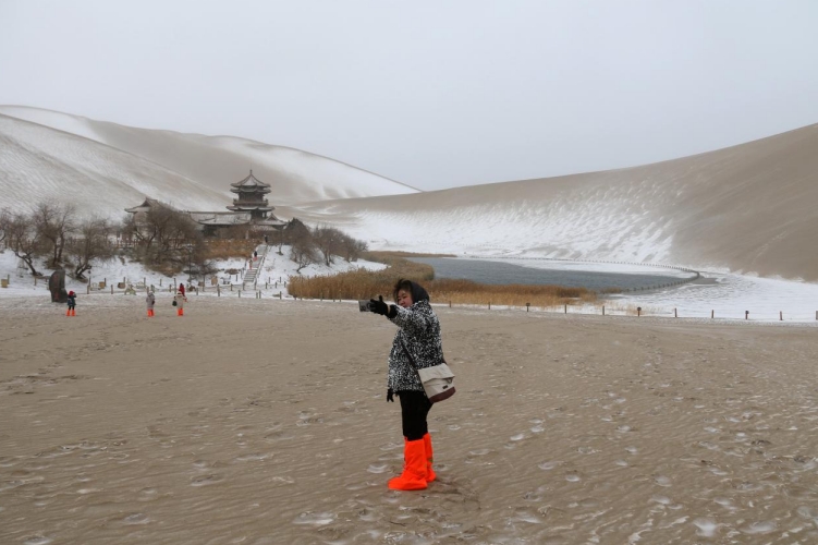 12月14日拍攝的甘肅省敦煌市鳴沙山月牙泉景區雪景。張曉亮攝