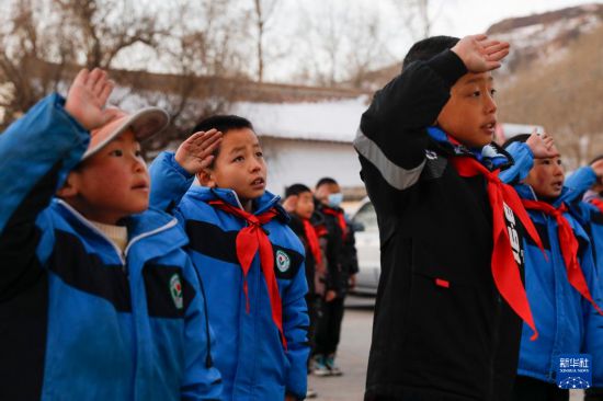 12月25日,積石山縣柳溝鄉陽山希望小學的學生在復課首日舉行升旗儀式。