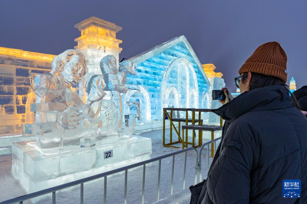1月4日,在哈爾濱冰雪大世界園區內,游客觀賞冰雕作品。