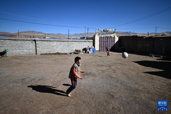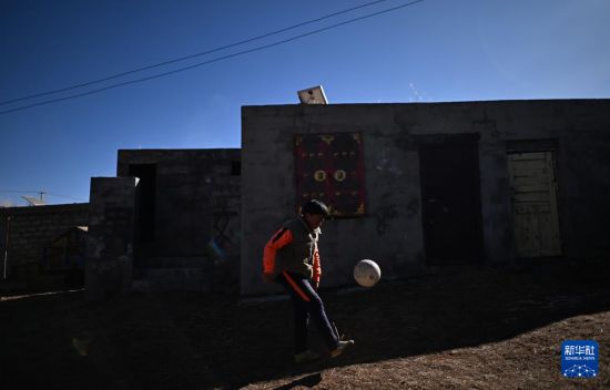 青海玉樹曲麻萊縣約改鎮中心寄宿制學校學生悟金唐巧多杰在家中踢球,作為曲麻萊青訓隊一員,他即將前往廣西壯族自治區北海市參加球隊冬訓(1月12日攝)。