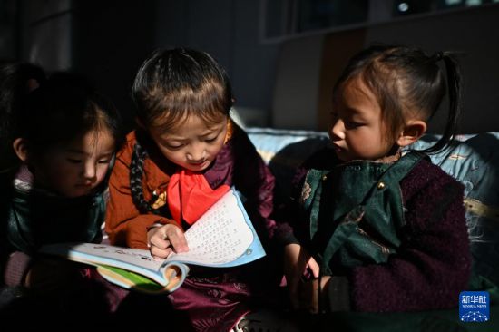 青海玉樹曲麻萊縣第二民族完全小學學生達沙旦增德金(中)在家中給妹妹講故事(1月12日攝)。