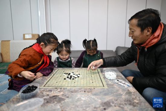 青海玉樹曲麻萊縣第二民族完全小學學生達沙旦增德金(左一)在家中和爸爸一起下五子棋(1月12日攝)。