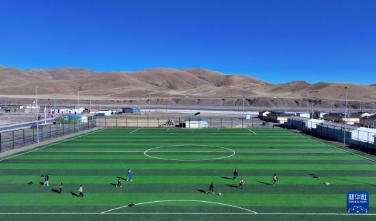 1月12日,孩子們在青海玉樹曲麻萊縣葉格鄉足球場上踢球(無人機照片)。