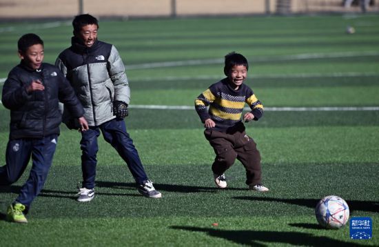 青海玉樹曲麻萊縣葉格鄉寄宿制小學學生卓瑪加(右)和伙伴們在球場踢球(1月12日攝)。